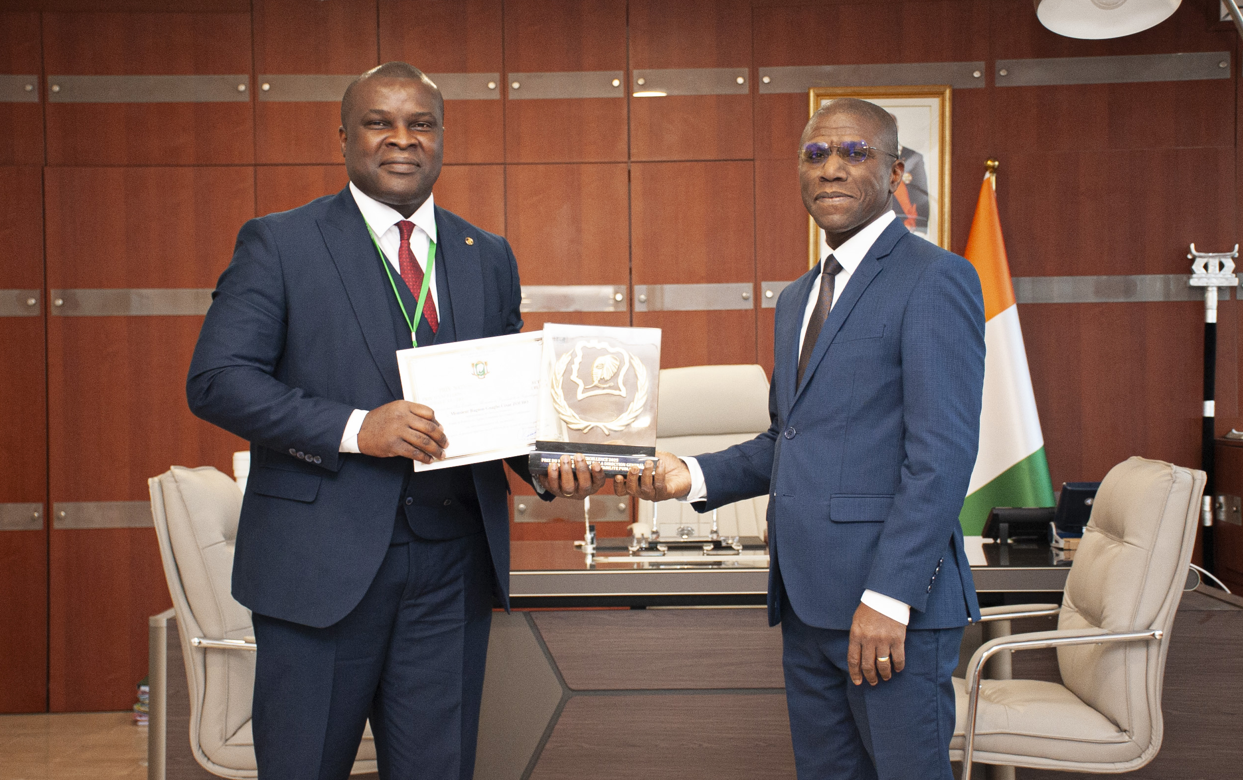Le meilleur agent du Trésor Public, au titre du Prix National d’Excellence 2025, M. ZOUHO Bagnon Gnagbo César, Fondé de Pouvoirs à l’Agence Comptable des Créances Contentieuses (ACCC), a présenté sa distinction, reçue des mains du Président de la République, SEM. Alassane OUATTARA, au Directeur Général, M. AHOUSSI Arthur Augustin Pascal, ce mardi 5 aout 2025, à son cabinet sis à l’immeuble SOGEFIHA, à Abidjan-Plateau.